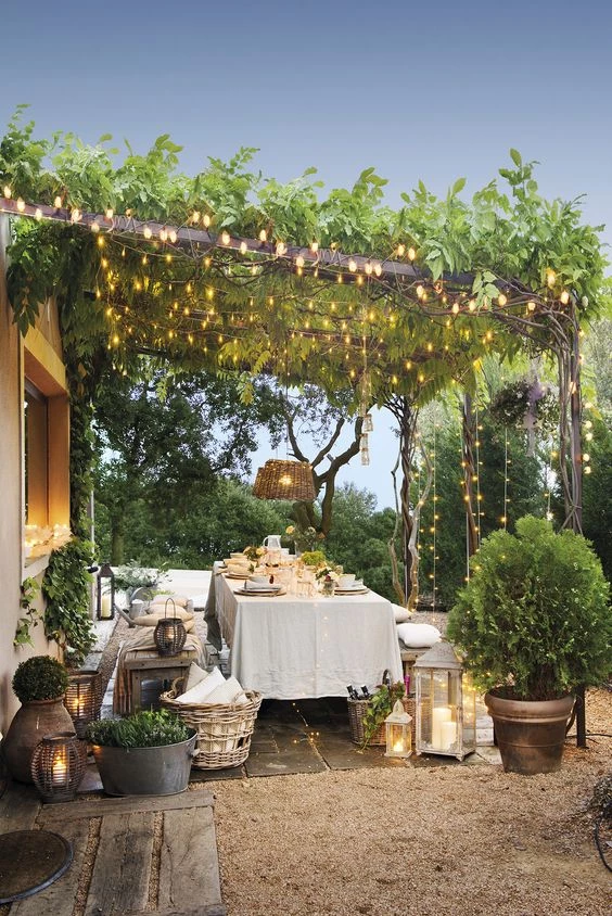 4. Fíjate cual va a ser el punto focal desde donde sucede la reunión, y generá un sector con flores de estación. Podés elegir contenedores como macetas, canastos, carretillas, regaderas. Se recomienda que las flores sean blancas para que se luzcan de noche, ya que es el color que más se ve.