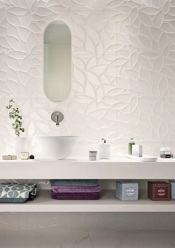 Los azulejos con relieve en color blanco son los más elegidos y son una excelente opción: una forma de aportar un toque 3D pero sin sobrecargar demasiado al ambiente.