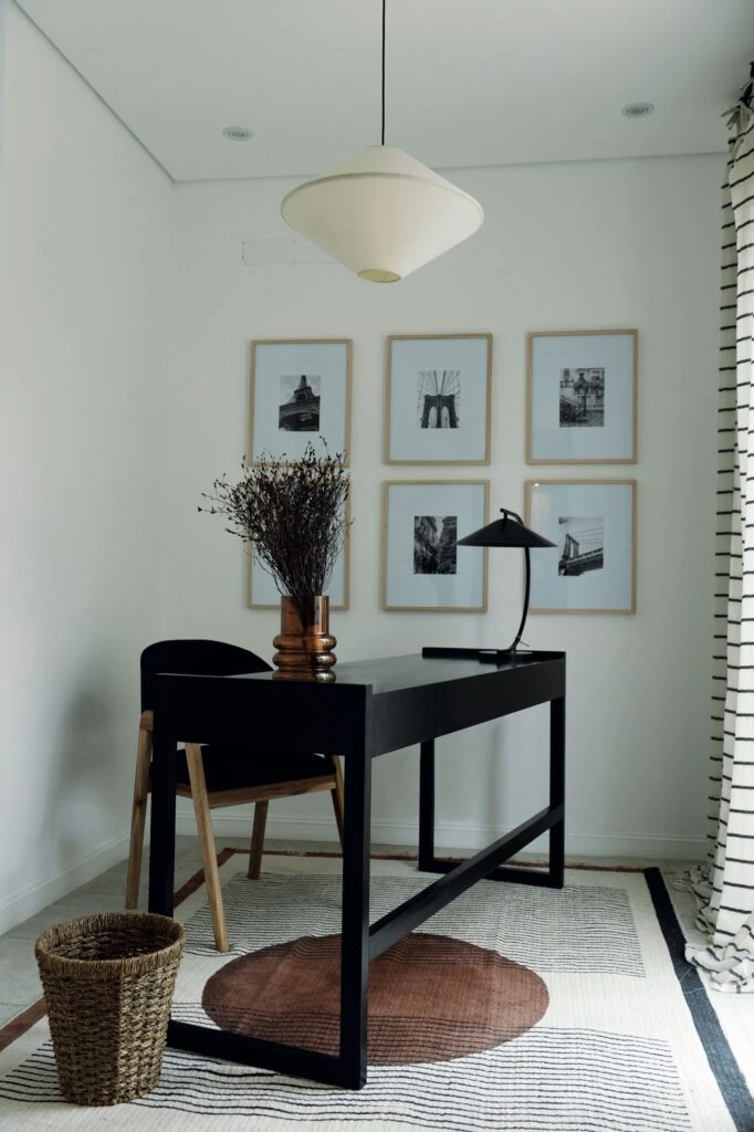 Una mesa de líneas simples haciendo juego con la silla tapizada en negro y la lámpara de mesa (@solpaloudeco) contrastan con los marcos de madera y las fotos en blanco y negro, la alfombra en tonos tierra y la lámpara de techo blanca (@solpaloudeco).