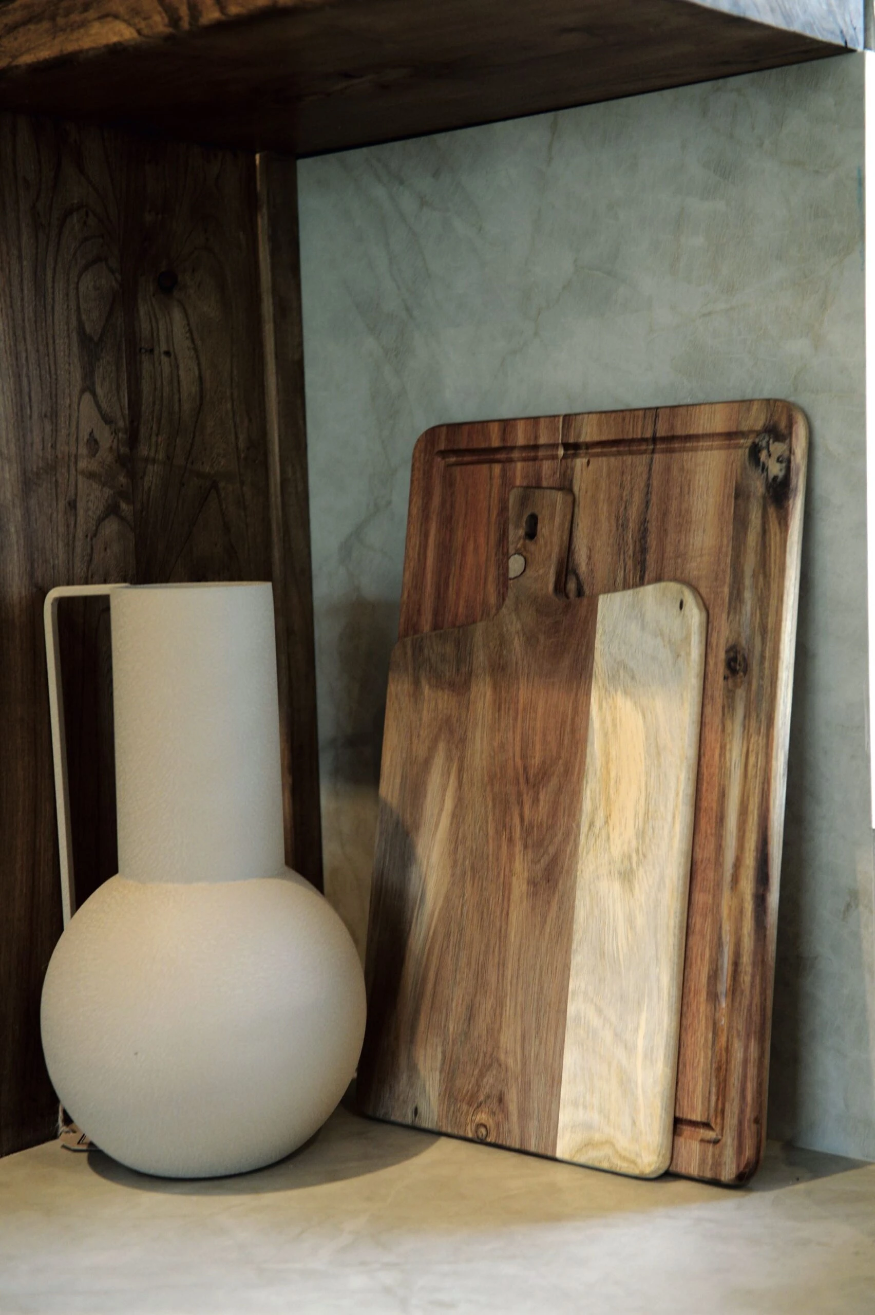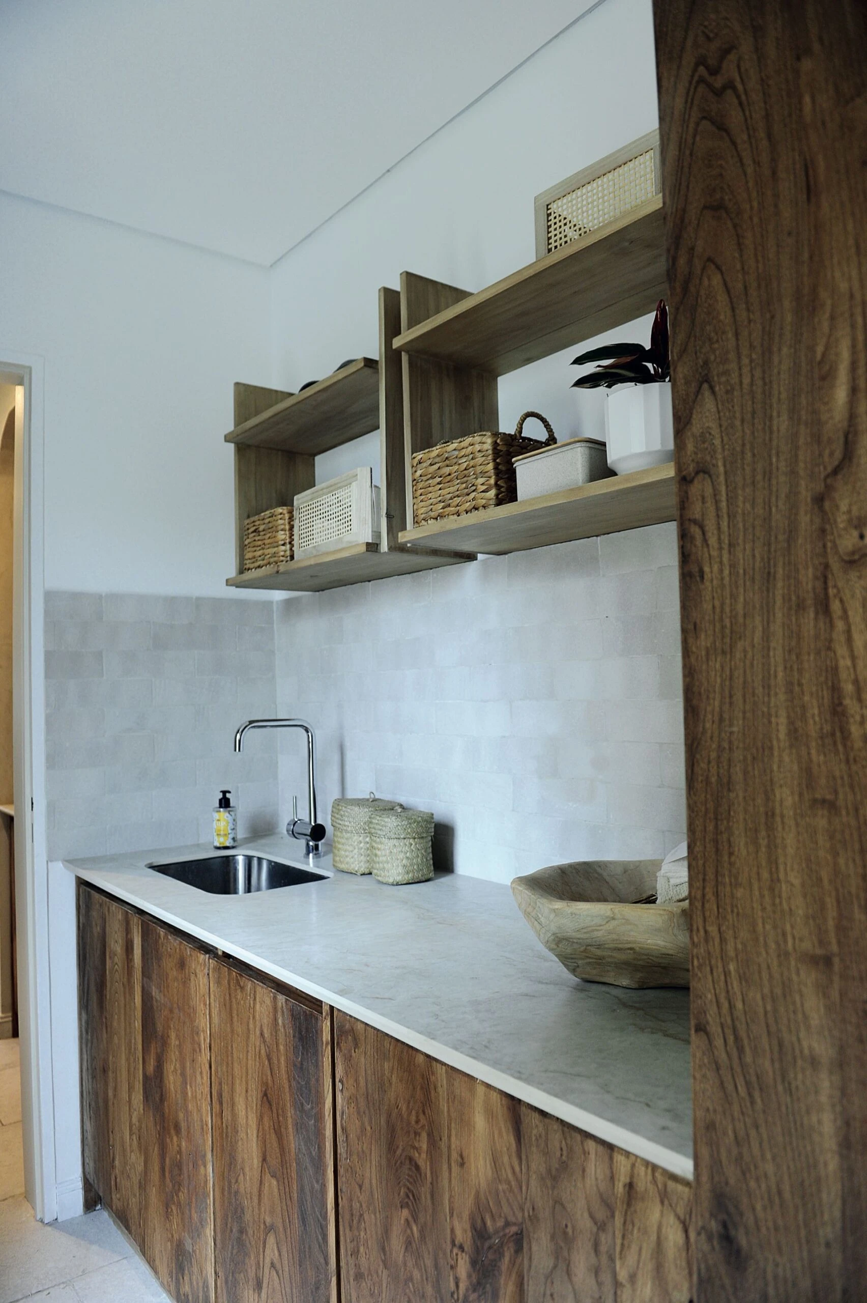 La cocina irradia armonía a través de una cuidada combinación de materiales nobles, iluminación suave y detalles artesanales.