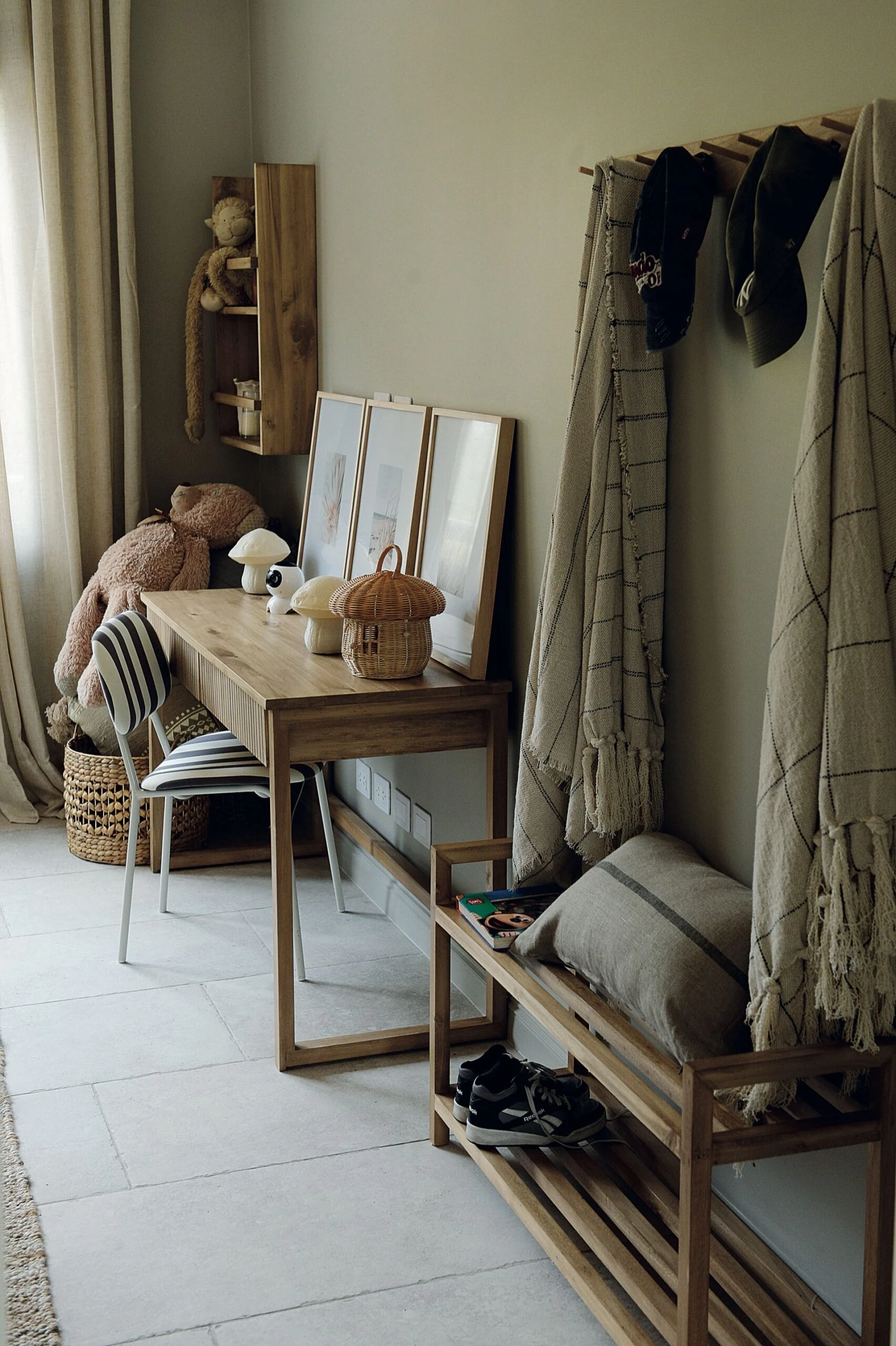 La pared estucada, el respaldo de cama claro y la lámpara de fibras naturales, suman contraste. Frente a la cama, un escritorio de madera y un perchero (@solpaloudeco).