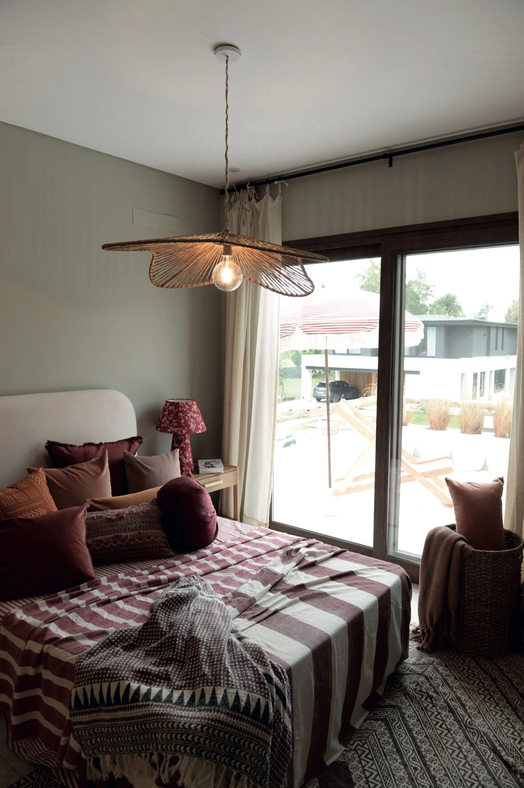 El dormitorio principal transmite una atmósfera de relajación total y conexión natural con toques rústicos.
