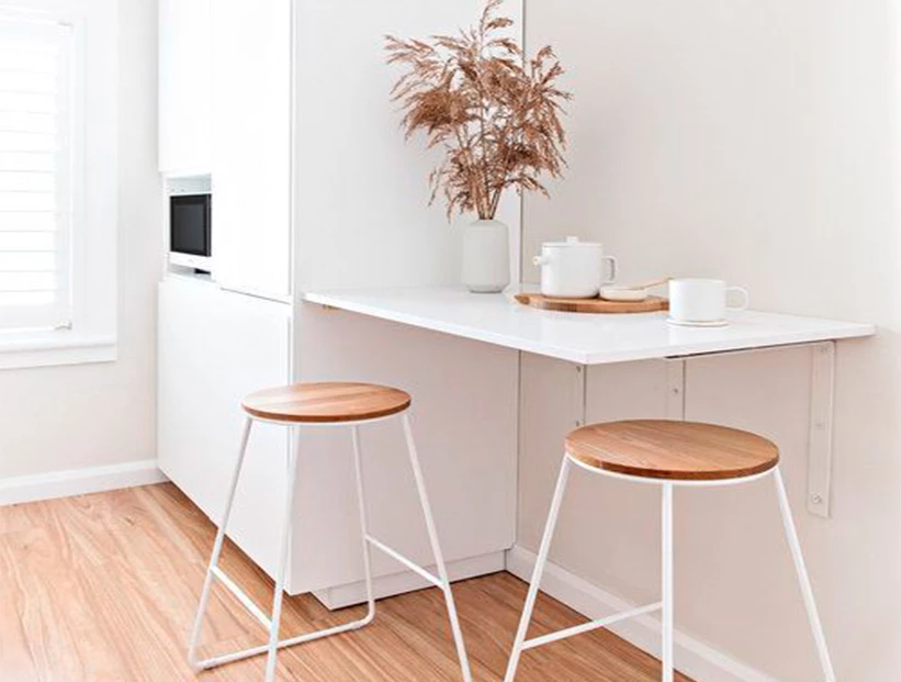En cocinas o comedores pequeños, los muebles funcionales resultan grandes aliados para optimizar el espacio disponible. Una buena opción son las mesas plegables que se abren y se cierran según sus usos. Además, resultan económicas y cuentan con una amplia variedad en materia de diseños, materiales y colores.