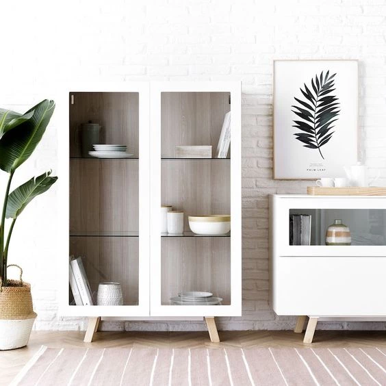 Una buena opción para vajilleros altos, puede ser colocar algun florero con flores frescas o varios adornos deco bajos. Incluso se podría sumar sin problemas una lámpara de poca altura.