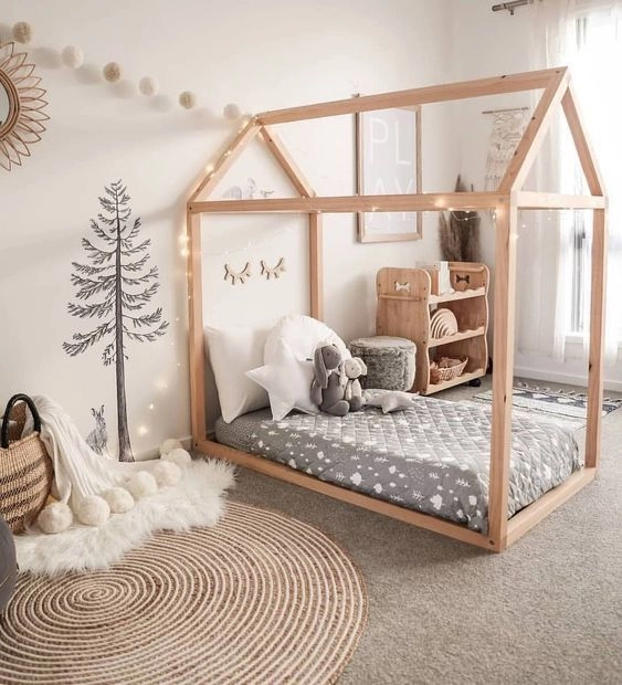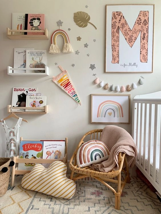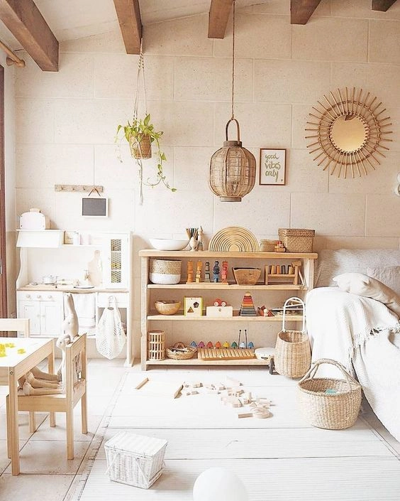 Una línea cromática suave como base es clave para decorar las habitaciones infantiles según el método Montessori. Es por esto que si se decide seguir un estilo boho chic, es fundamental que las paredes del cuarto sean de colores claros y neutros, ya que suelen estar cargadas de estantes con juguetes y libros, cuadros y otros accesorios decorativos como espejos, guirnaldas y tapices.