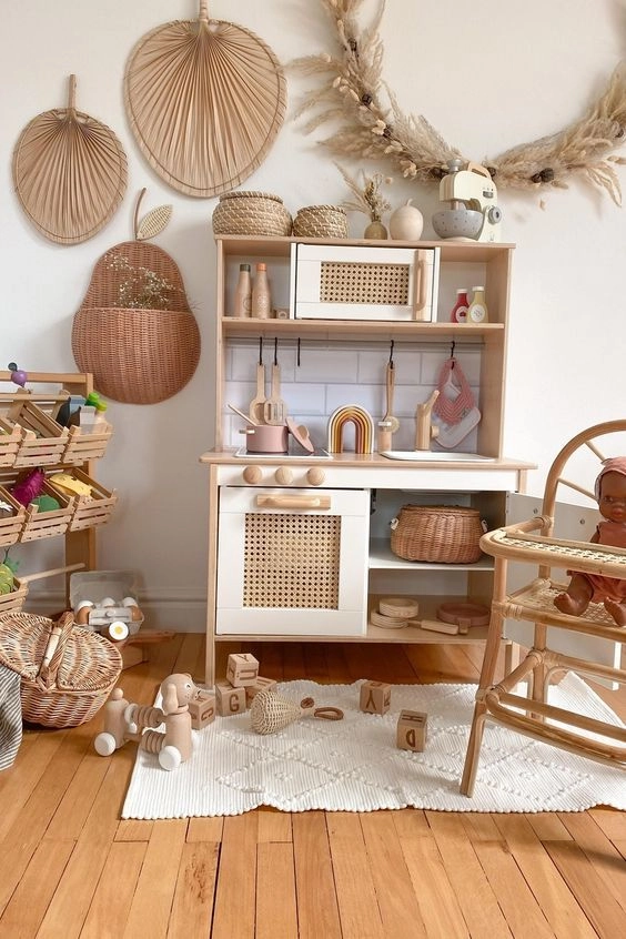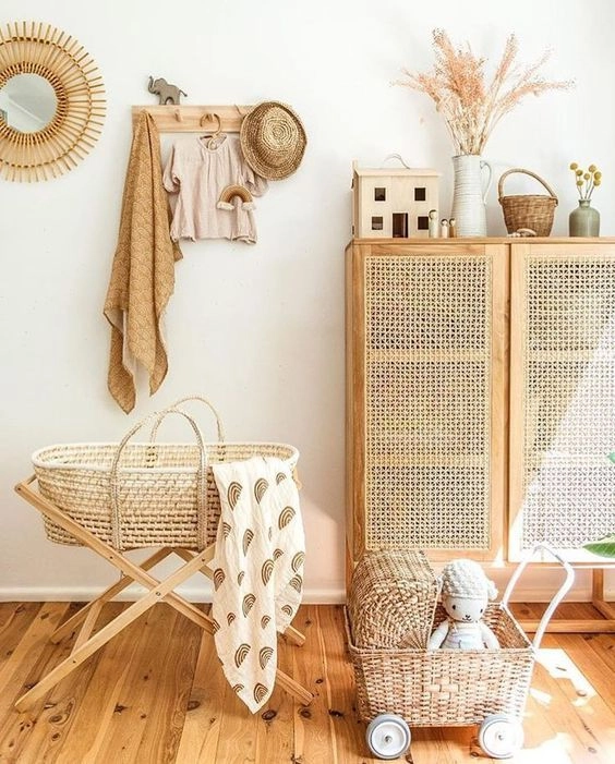 Los muebles de madera y de fibras naturales como rattán, mimbre, bambú y yute cobran protagonismo en los cuartos infantiles con estilo boho chic, así como también la presencia de los textiles en abundancia.