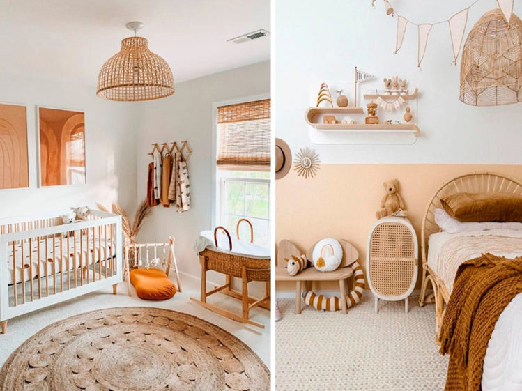 Los muebles de madera y de fibras naturales como rattán, mimbre, bambú y yute cobran protagonismo en los cuartos infantiles con estilo boho chic, así como también la presencia de los textiles en abundancia.