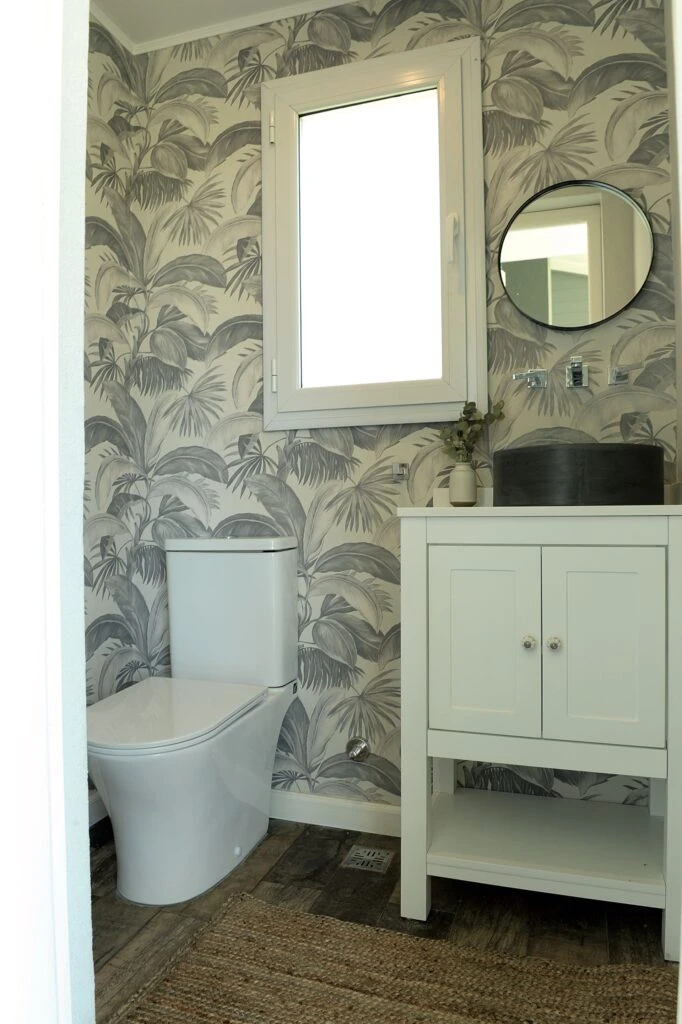 Inspirado en los baños de los hoteles más lujosos, este estilo apuesta por empapelados con textura, espejos retroiluminados y griferías minimalistas en negro o bronce. La clave: que cada detalle parezca de alta gama.