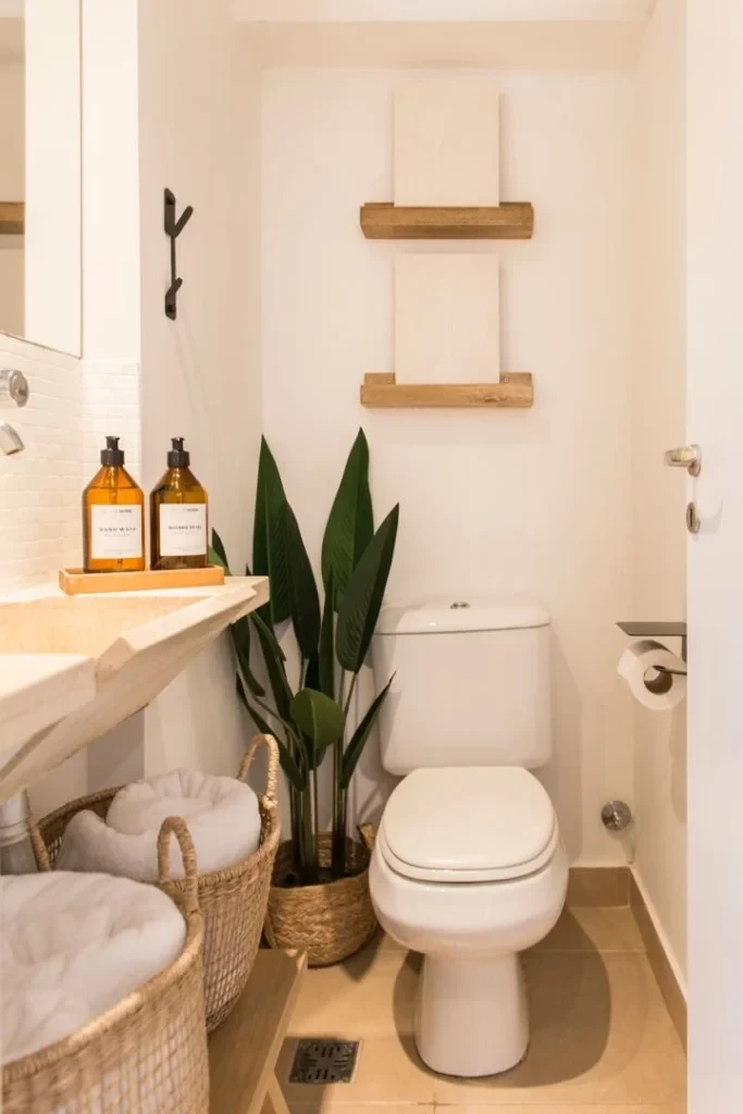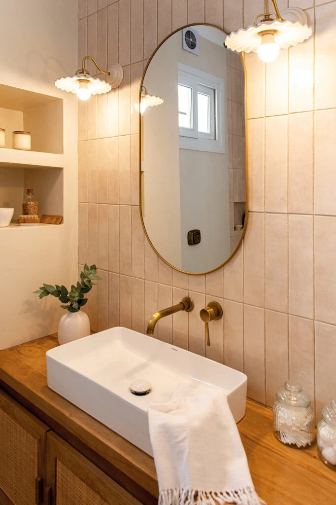 La calidez de la madera se mezcla con paredes de microcemento o piedra natural. Podés sumar una bacha de mármol o con onda artesanal y algún detalle en hierro negro para darle ese toque de diseño sin perder la onda relajada.
