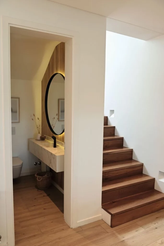 El bajoescalera de esta casa diseñada por Roxana Lotersztain (@rl.interiordesign) se aprovechó para ubicar allí un pequeño toilette con una pared revestida en varillas de madera de kiri, una angosta mesada con bacha integrada en Dekton Aura y grifería negro mate lateral. Las escaleras llevan peldaños de lapacho.