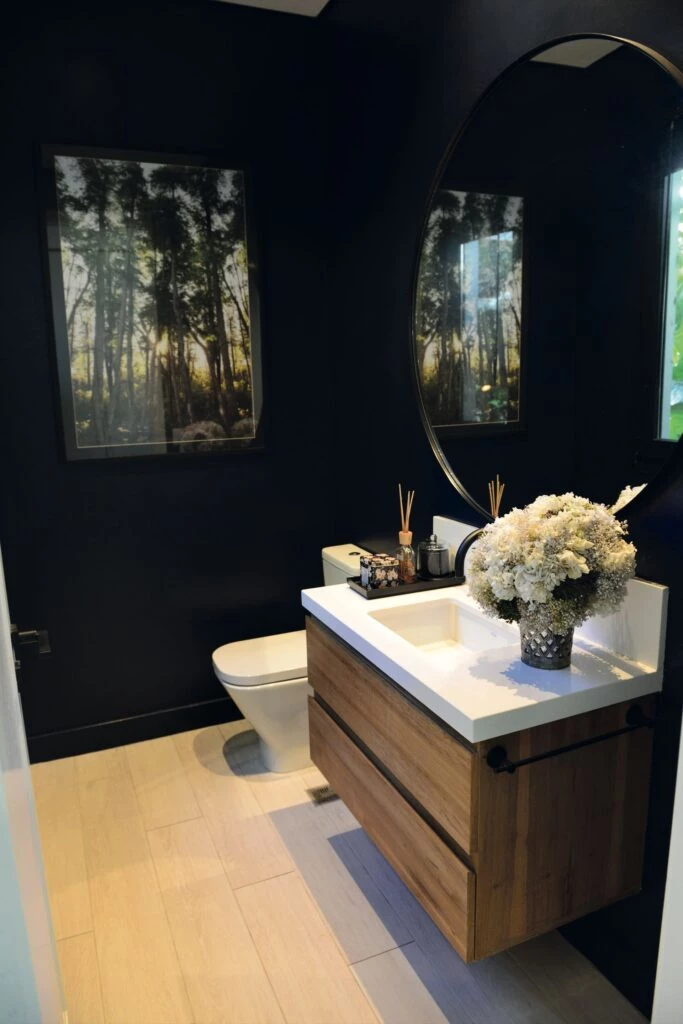 El toilette de esta casa cálida y elegante se anima al negro total. Un mueble de petiribí con mesada de Silestone y una fotografía de un bosque tomada por la dueña de casa, Fini Perez Alati, complementan la escena y decoran el espacio.