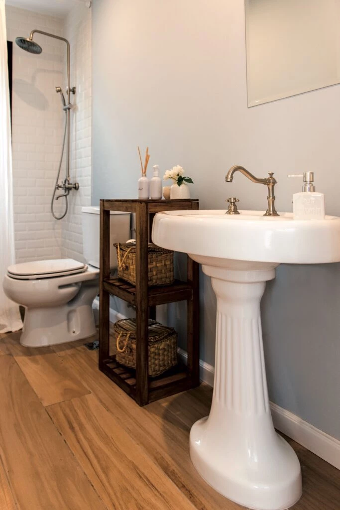 El toillete de la casa Belén (@haciendounacasa) tiene paredes en color celeste pastel, bacha antigua con pedestal restaurada (@cristalsanitarios) y grifería estilo antique en acabado bronce (Grifos Ya). El área húmeda suma azulejos y una columna de ducha externa. Un mueble de madera con dos canastos de fibras naturales suma espacio de guardado.