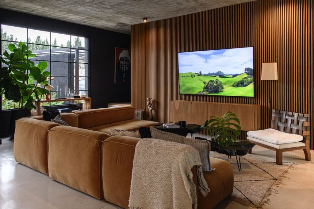 El color negro también dice presente en interiores, siempre en la dosis justa y perfectamente combinado con muebles y revestimientos en madera de petiribí, como la pared completa enchapada con un varillado de piso a techo. Los amplios ventanales juegan un rol fundamental en las visuales, logrando fusionar armoniosamente el exterior con el interior.