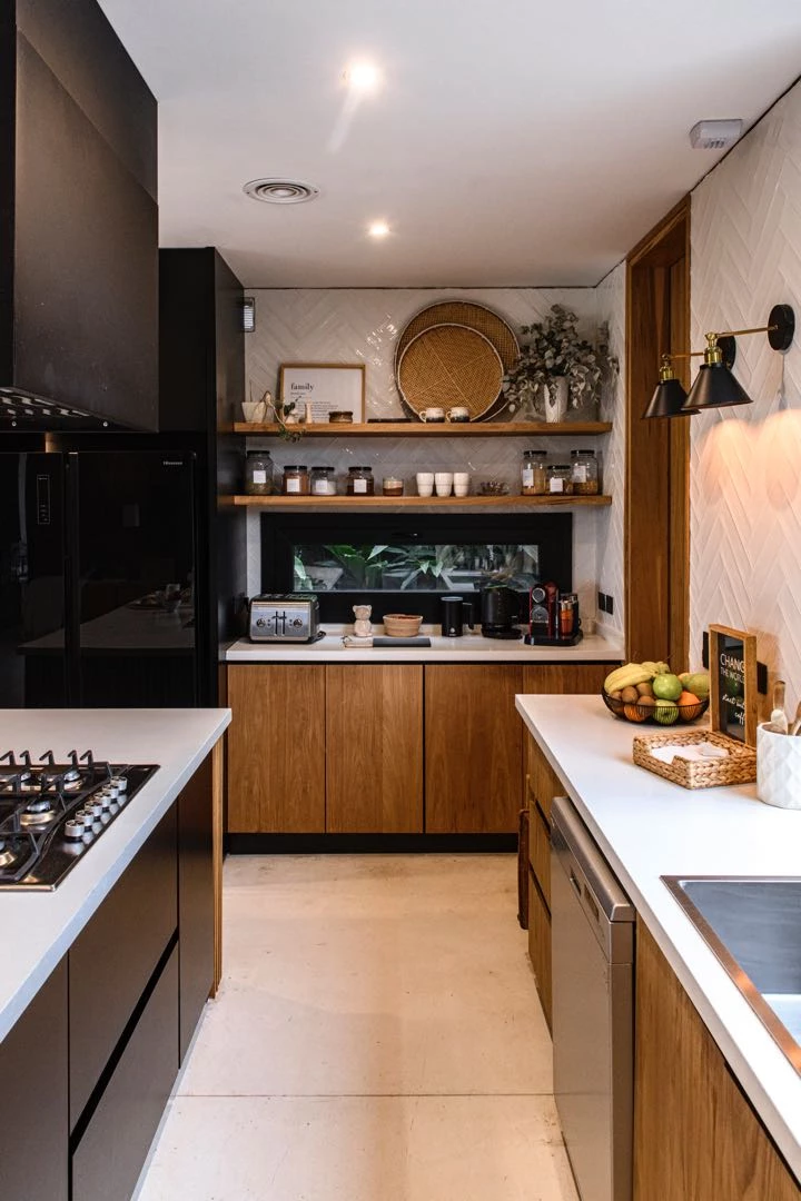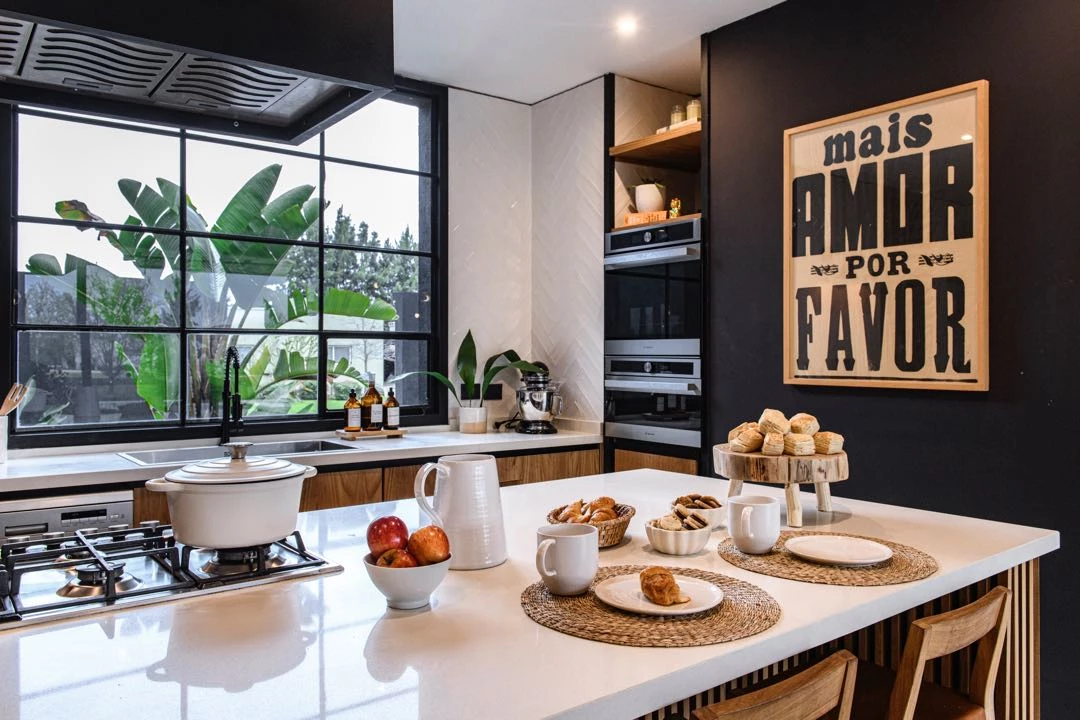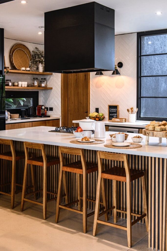 La cocina es el corazón de esta casa, ya que juega un papel central. Integrada al área social, propone una amplia isla revestida en varillado de madera de petiribí y mesada en cuarzo blanco. Su diseño estuvo a cargo de Esteban, marido de Paula y chef, quien priorizó contara con buenas visuales hacia el exterior a la hora de cocinar