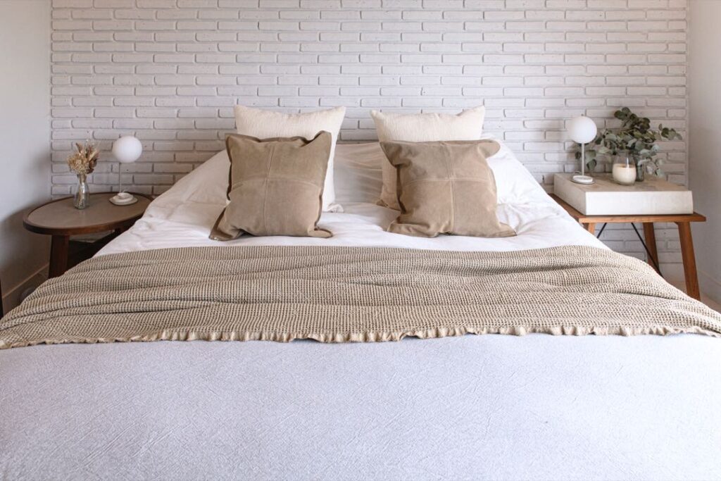 Ropa de cama (Textura Home), mesa de luz (@minimahuela), lámpara colgante (Malacara Taller).