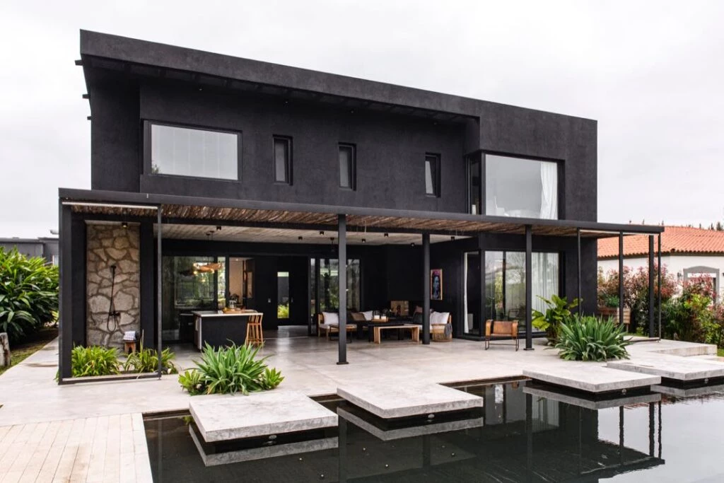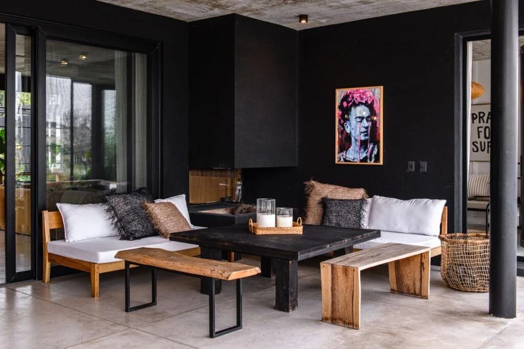 La casa está totalmente revestida en color negro límite (Sitex), tanto en el frente como de cara al jardín, al que se asoma una amplia galería estratégicamente pensada para compartir con amigos. Tiene un living con sillones de madera (VEM maderas), bancos (@solpalou), una mesa a medida (@decolodd), velas (@mecopa_deco) y almohadones (@onixhomedeco) que aportan calidez y comodidad y reúnen a los invitados alrededor del fuego.