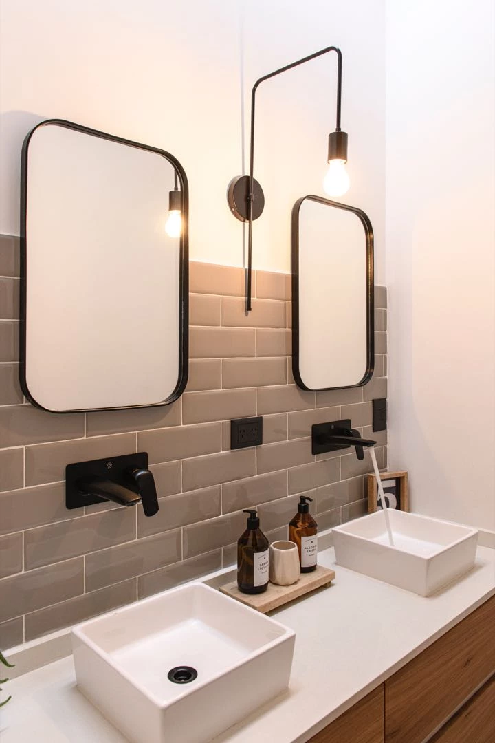 El baño de los niños tiene azulejos subway en gris (Syria cerámicos), grifería Epuyén negro (FV).