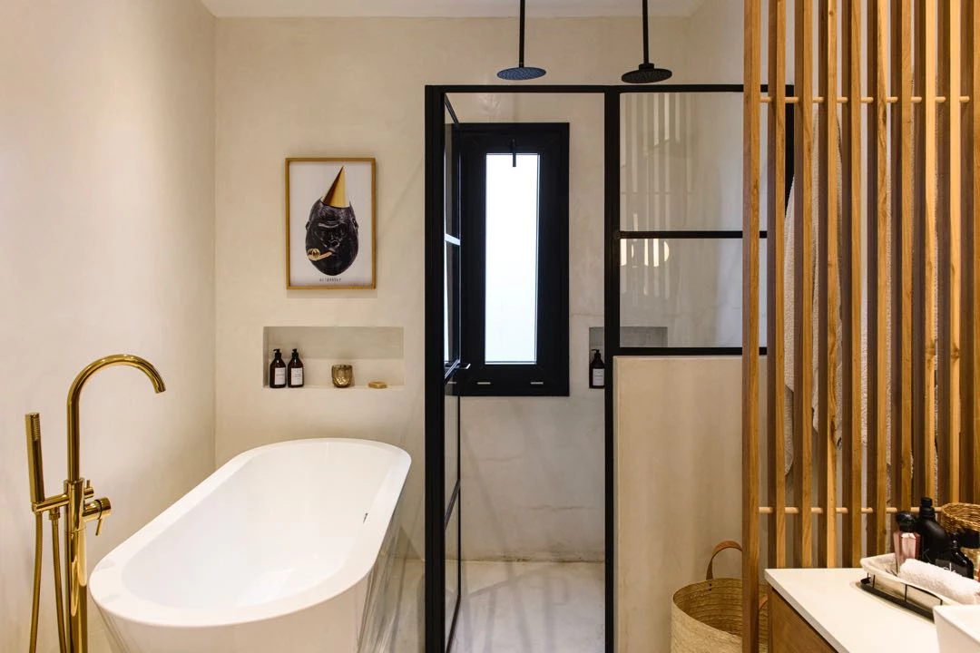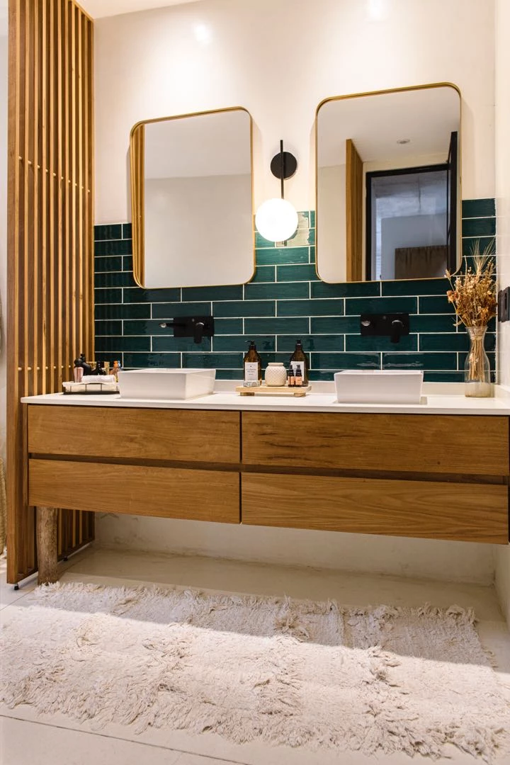 El baño en suite -diseñado íntegramente por el estudio @decolood- propone una mesada de cuarzo blanco, un vanitory de madera de petiribí, grifería modelo Epuyén negro (FV) y alzadas con azulejos estilo subway en verde (Syria). Los espejos llevan marcos en hierro bronce viejo (Tienda Quadra) y el box de ducha en hierro y vidrio repartido se separa del resto del baño con un biombo varillado en petiribí. Lo acompaña una bañera exenta, con grifería dorada.