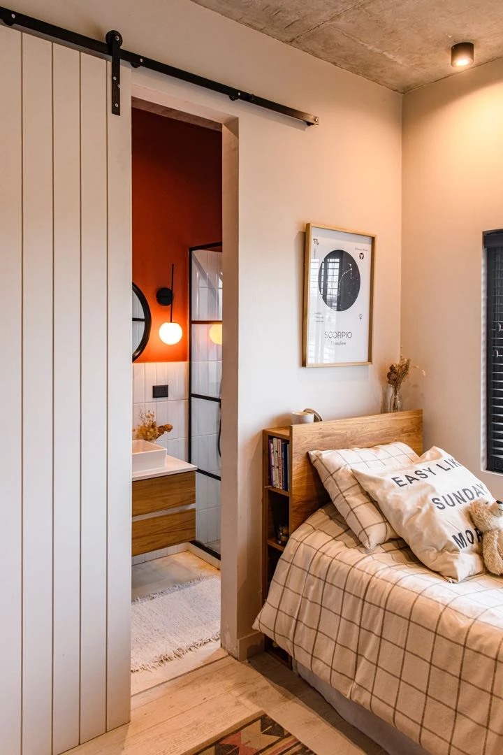 Para el dormitorio de Emma las interioristas diseñaron un respaldo enchapado en petiribí con compartimentos de guardado. Por una puerta granero asoma el baño en suite.