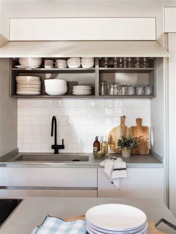Está claro que a mayor cantidad de alacenas, más espacio de guardado. Pero si la cocina es chica, los estantes abiertos son los mejores aliados para sumar espacio de almacenaje pero también un punto focal súper deco y muy de moda. Además, al ser abiertos, permiten ver en fondo de la pared y no recargan el espacio como las alacenas cerradas. Se recomienda colocarlos en lugares angostos y en esquinas.