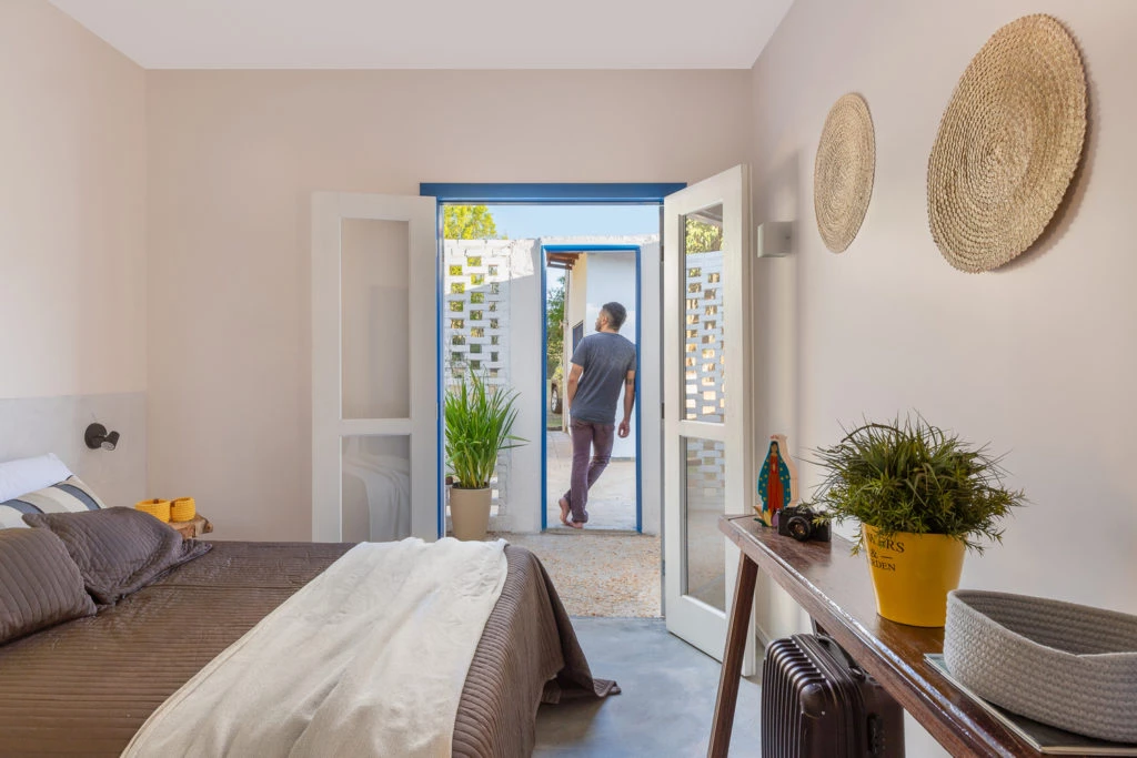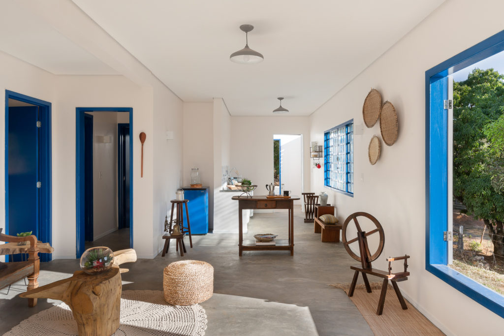 Las puertas, los marcos de las ventanas y la estructura del porche se destacan por la presencia de 'Azul França' (Azul de Francia), un color fuerte que sigue la tonalidad de la pintura utilizada anteriormente en las puertas y cercas de la finca. Como tal, los mosaicos blancos y azules realzan cómo los recuerdos de color guían la estrategia de diseño de la renovación.