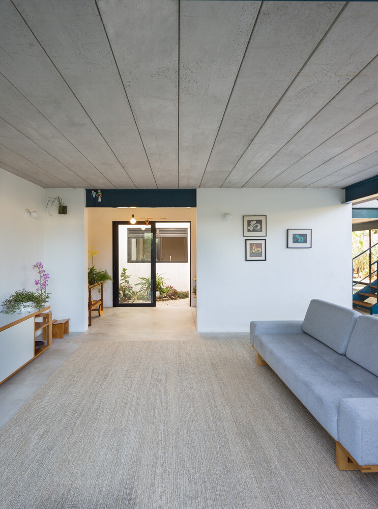 El diseño mantiene la misma paleta de colores y materiales en todo el interior y el exterior de la casa, utilizando hormigón gris texturizado para los pisos, paredes de hormigón blanco, objetos de madera natural y azul para distinguir elementos y objetos específicos.