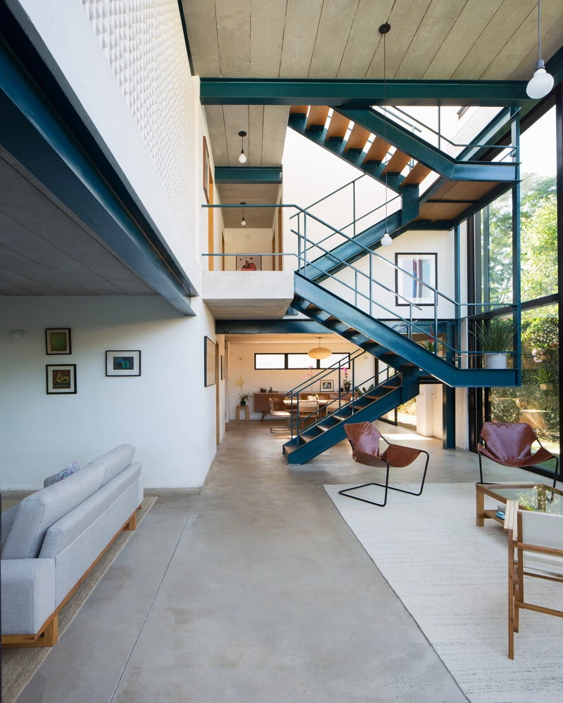 Colgadas de la estructura superior, las escaleras de colores cumplen dos roles: un elemento visual atractivo y una conexión funcional entre áreas. Si bien la casa combina el porte de la pared con el acero estructural, la aplicación de color a este último resalta su jerarquía estructural.