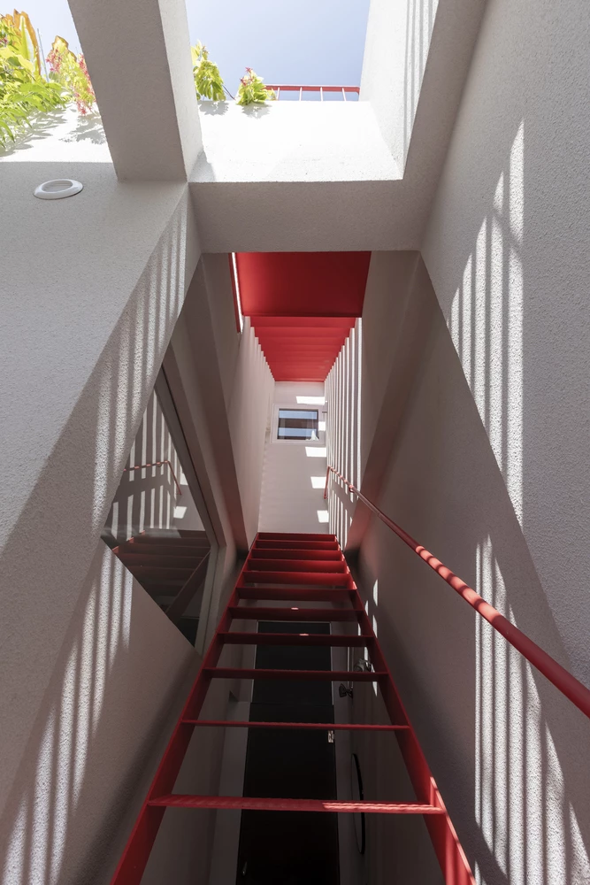 El volumen de hormigón blanco juega con toques de rojo en las escaleras de acero, barandillas y puertas para llamar la atención de las personas.