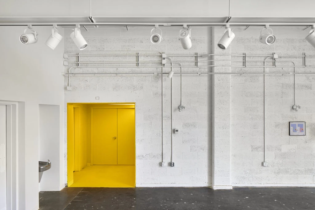 El espacio de la galería juega con la implementación de paneles de policarbonato guantera y la luz difusa que reciben las grandes puertas vidriadas que conectan con la calle. Frente a la calle, la variada materialidad de la fachada combina elementos existentes con un amarillo brillante que llama la atención sobre los nuevos elementos arquitectónicos.