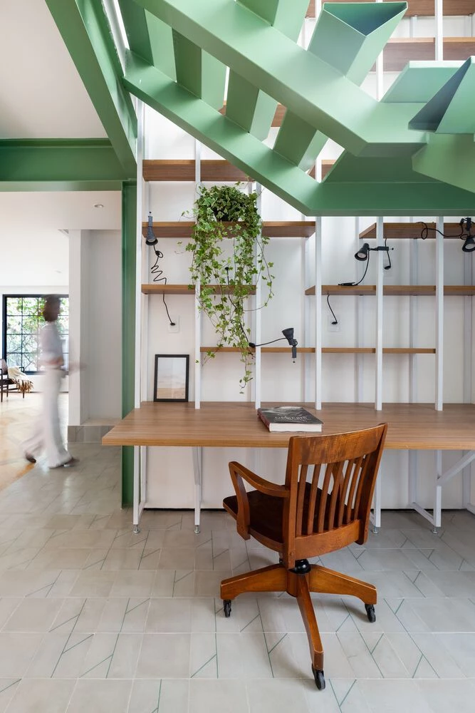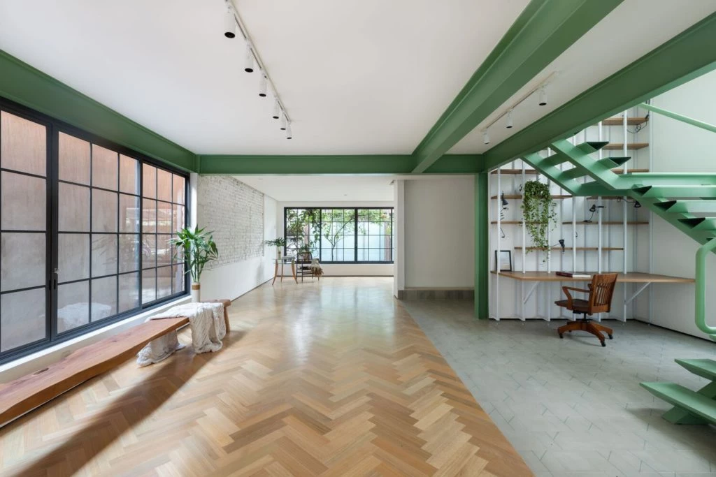 Al demoler las paredes internas, 'Gama House' creó un entorno integrado que está encerrado por una nueva estructura verde, que no solo sostiene el segundo piso del edificio, sino que agrega color al espacio mientras mantiene un diseño simple.