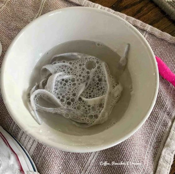 Para lavar los cordones, lo primero que tenés que hacer es ponerlos en un recipiente con agua tibia, jabón y un chorrito de vinagre blanco. Después vas a frotarlos con ganas para terminar de eliminar las manchas difíciles que hayan podido quedar impregnadas.