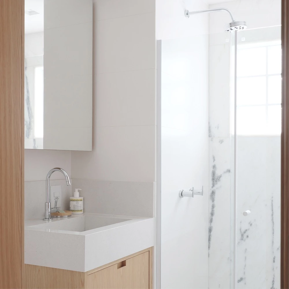 Para maximizar la funcionalidad del espacio se creó una pared de estantería multifuncional dentro del departamento. Esta intervención tiene la capacidad de definir los espacios y proponer una nueva articulación de las dos áreas identificadas aquí: privada y social.