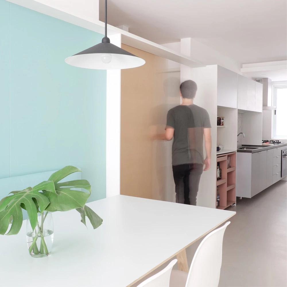 Paneles que se abren para revelar el baño y se cierran para dar privacidad a las habitaciones. Paneles que se abren al cocinar y se cierran cuando la cocina se convierte en un espacio de trabajo. Muebles que se mueven para maximizar espacios de funcionalidad social según los diferentes momentos.