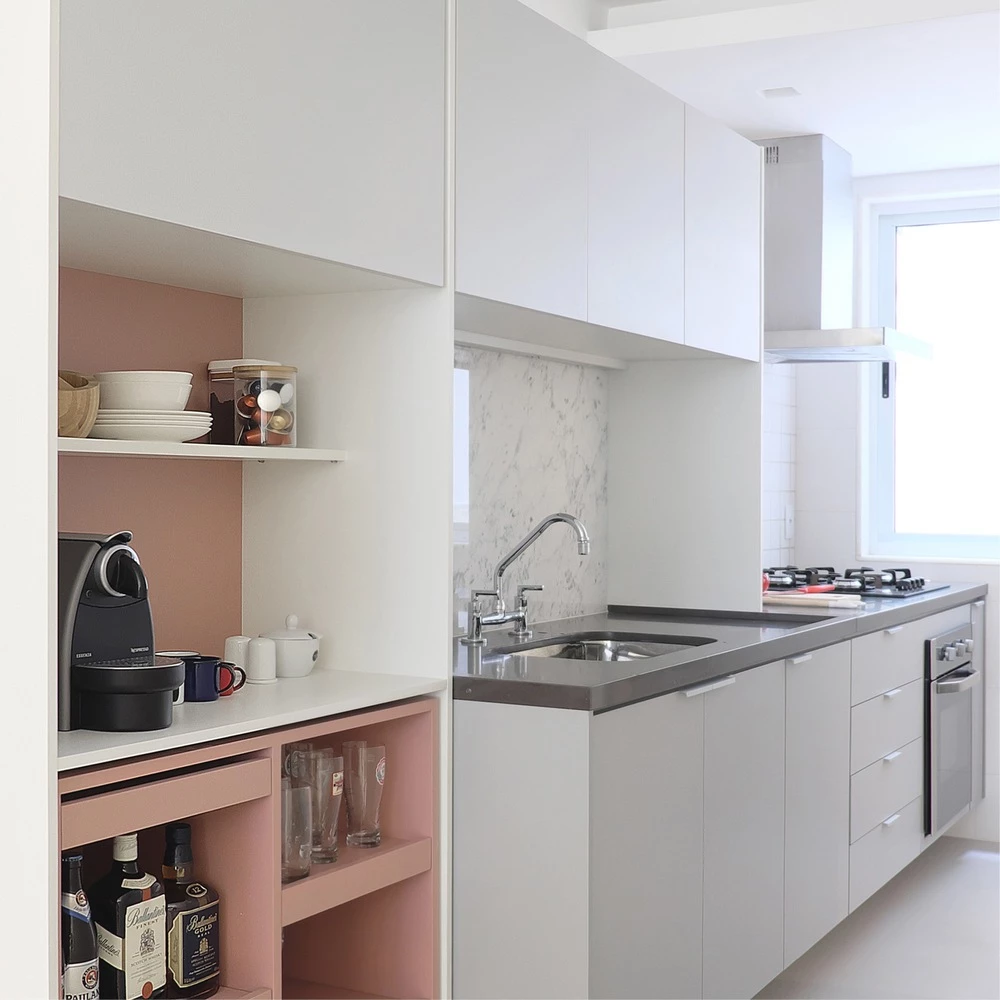 La configuración original del depto era bastante clara: una pared larga que separaba el sector de las habitaciones de la parte social y de la cocina. En este sentido, la propuesta del equipo para la renovación vino de una premisa básica: explorar el eje longitudinal del departamento creando una secuencia de ambientes que permitan subvertir la pared original y optimizar espacios.