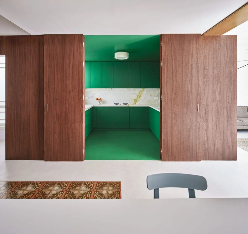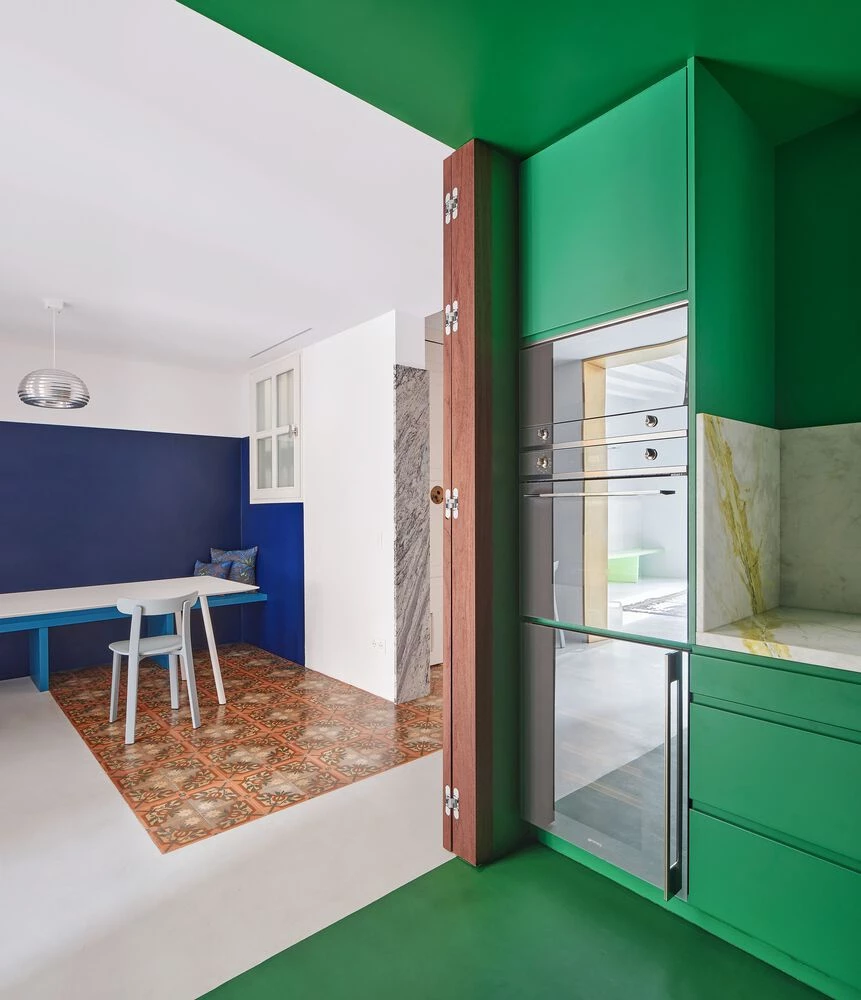 Sus entradas se disimulan en el frente, con todas las puertas enrasadas, y cada uno de estos espacios sigue una ley propia, como si fueran espacios independientes que comparten una misma calle de acceso: la cocina abre hacia el comedor como un mundo verde con una banda blanca y amarillenta en el frente de mármol; el baño compartido juega con distintos nichos y tonos de verde y amarillo, mate y brillantes, mientras que los dormitorios son entornos más calmados con suelo de madera de roble y apuntes en azul mediante revestimientos de pared o los diseños textiles de Catalina Montaña, hechos expresamente para este proyecto.