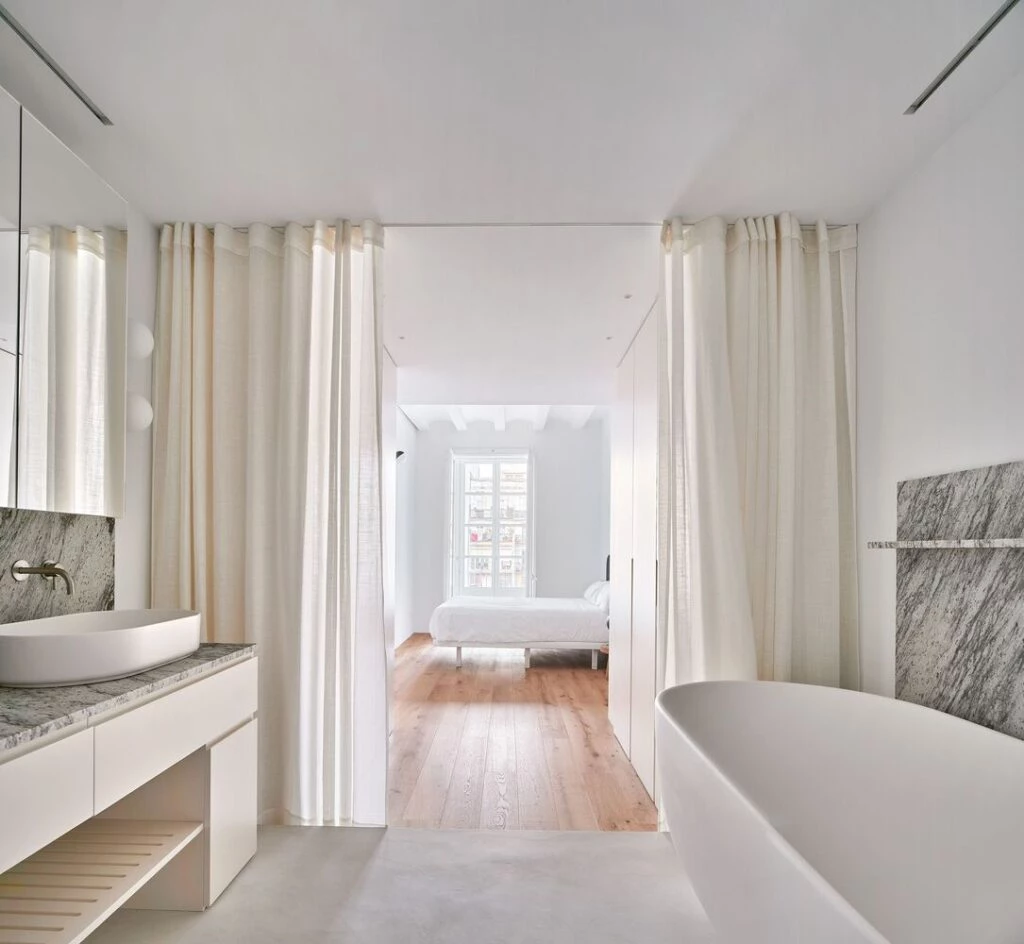 Este espacioso y largo departamento está ubicado en una finca noble de finales del siglo XIX. Disfruta de una posición privilegiada dando fachada tanto a la calle Girona como a un amplio patio de manzana, típico del ensanche barcelonés.