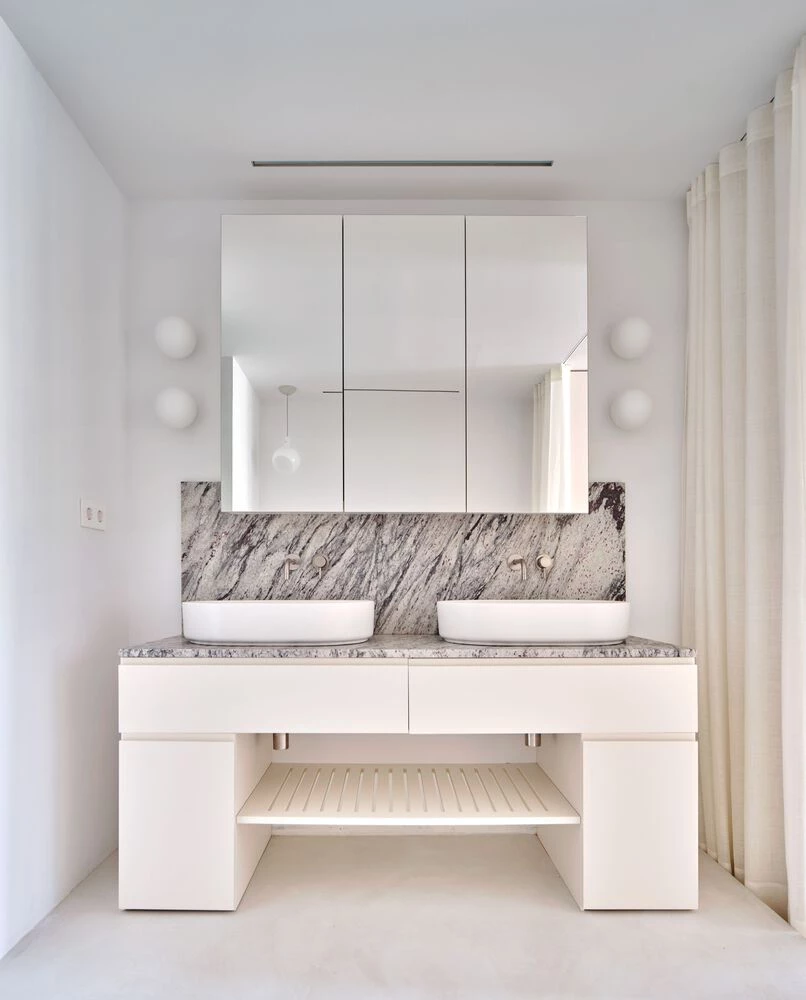 Todos los espacios comunes están unidos por un mismo pavimento de microcemento blanco, mientras que suelos de mosaico hidráulico recuperados se disponen en lugares clave, continuando el eje del plano de madera hacia el salón mediante dos tipos de mosaico deslizados entre sí, o dando la bienvenida en el acceso y dirigiendo los pasos hacia el comedor.