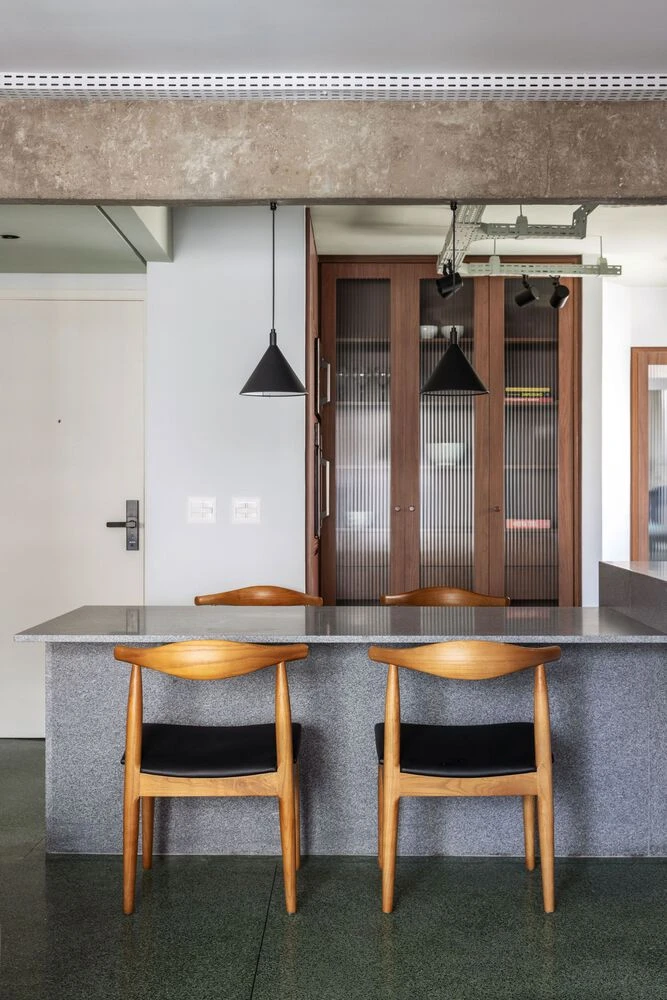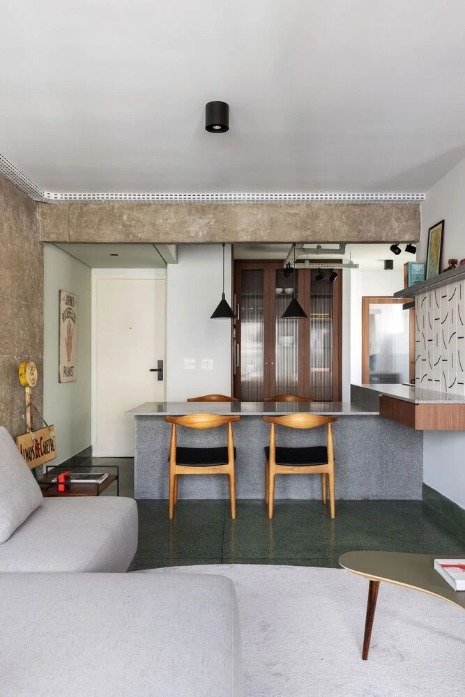 El proyecto, de estilo contemporáneo, está inspirado en la arquitectura brutalista de San Pablo, Brasil. Se expusieron columnas y vigas de hormigón, y el piso en terrazzo verde con detalles en granillas negras define el carácter del entorno.