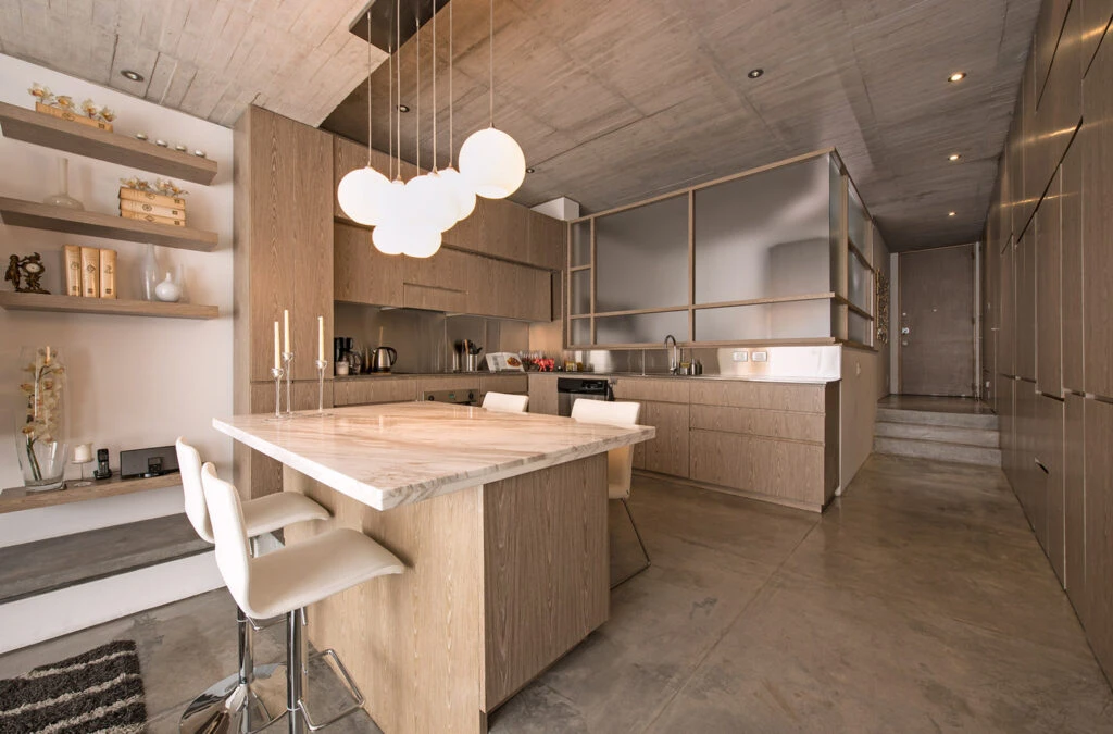 El departamento está configurado como un espacio único. Tiene una cocina que es el corazón del proyecto, un cuarto y un área social.