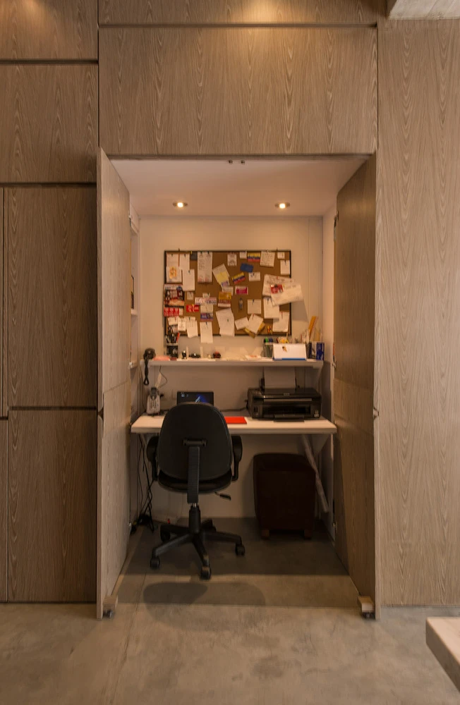 El mueble protagonista fue diseñado pensando en la funcionalidad y la flexibilidad. Y es que además de permitir la colocación de servicios adentro, sirve como almacenamiento para diferentes tipos de objetos e incluso puede convertirse en una mini oficina.