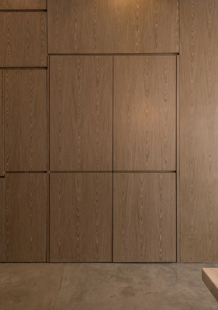 La madera es el elemento predominante de la obra: evoca el interior de un barco y crea una sensación de abrigo y calidez en el espacio. Por su parte, el cemento que se encuentra en el piso y el techo marca un rico contraste.