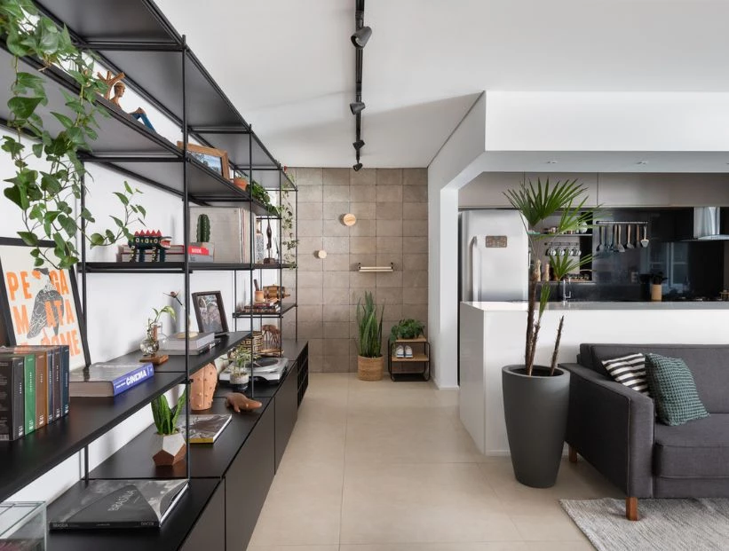 Allí, una gran biblioteca de metal hecha de varillas lisas organiza y exhibe objetos decorativos, libros, discos de vinilo y plantas, además de los juguetes de la pequeña hija.