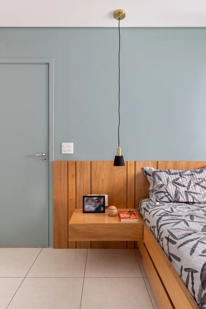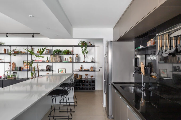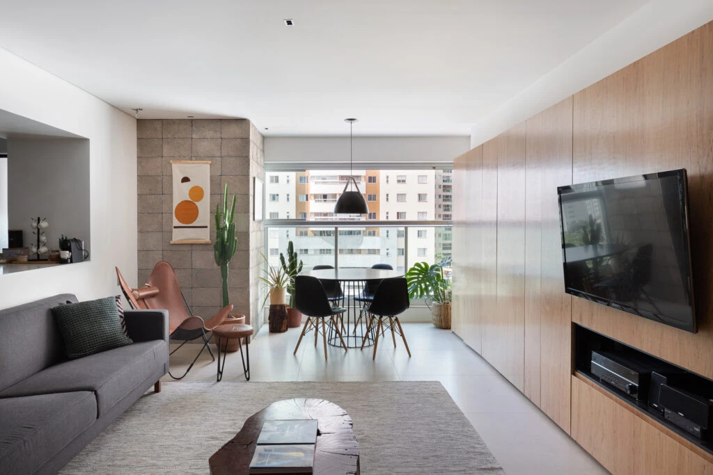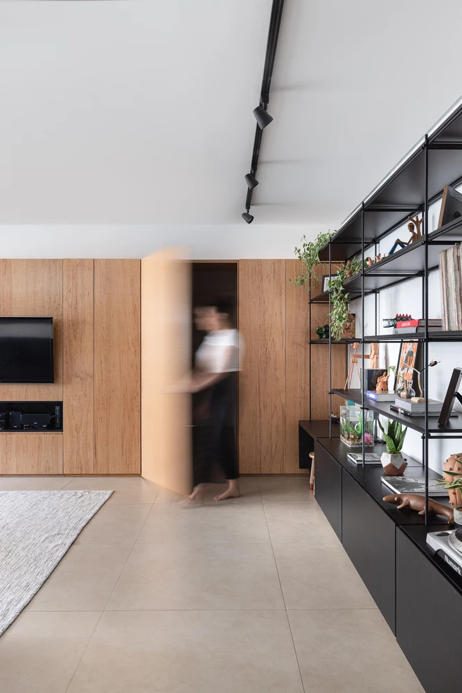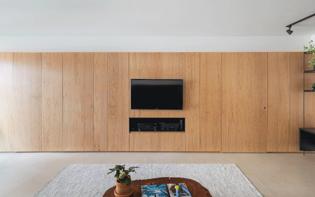 A partir de esta base inicial, el equipo de arquitectura buscó elementos que pudieran reforzar la sobriedad visual, como los muros de bloques de hormigón y la mesada blanca, en contraste con la madera del panel principal del ambiente, elemento multifuncional que disfraza la entrada a las habitaciones, almacena vajilla, equipos de televisión, hamaca paraguaya, y otros objetos.