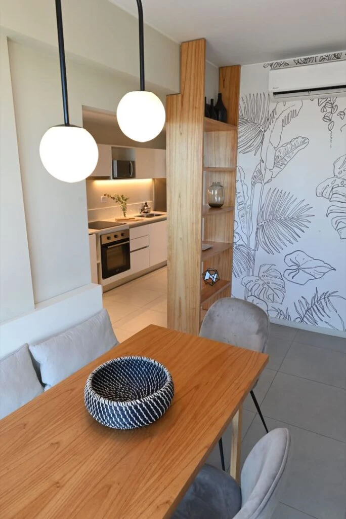 El motivo del papel mural se repite en la pared que acompaña al comedor diario, que fue parcialmente integrado a la cocina abriendo la pared y sumando una estantería sin fondo, que actúa como elemento de transición entre los distintos usos. Así se puede disfrutar estando en la cocina sin perderse de lo que pasa en el sector del comedor diario.