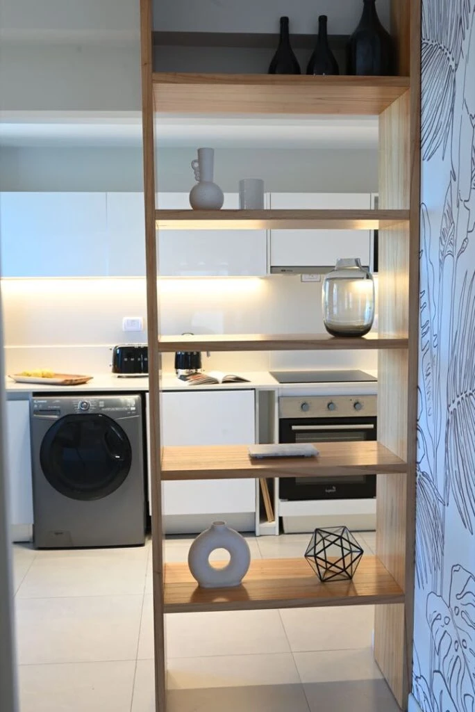 Este mueble abierto oficia de nexo entre el office y la cocina.