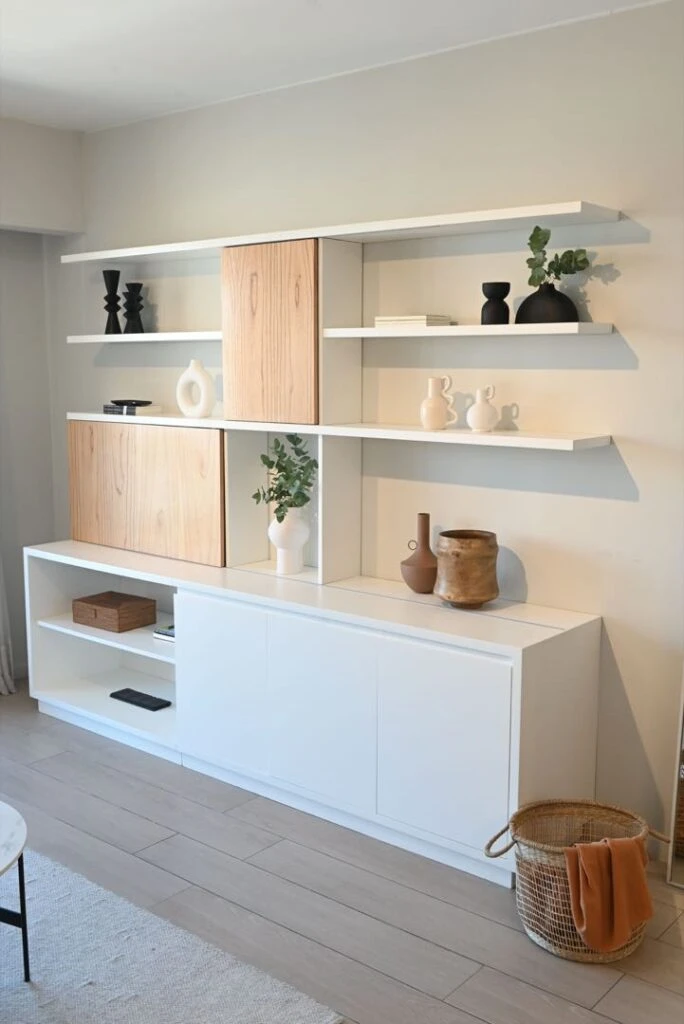 Frente al sillón se ubicó una biblioteca de usos múltiples, con espacio de guardado, un sector bar y un escritorio para el dueño de casa en sus días de home office. Los paneles corredizos generan el cambio de función al desplazarlos y cerrarlos. Objetos (@sekkeidecor y @vk.home).