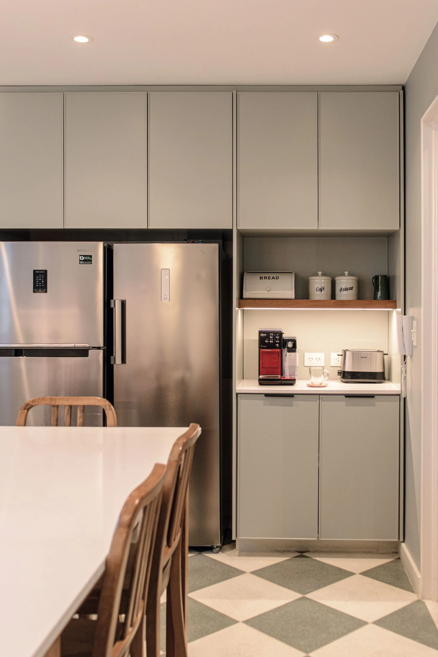La cocina fue el espacio donde se hicieron los mayores cambios. Por un lado, fue ampliada para ganar metros y comodidad. Además se cambiaron todas las ventanas, y el piso anterior fue reemplazado por unos terrazos en damero (Quadri Mosaicos) de un color similiar a los muebles , íntegramente laqueados con el color Magnetic Grey (Sherwin Williams).