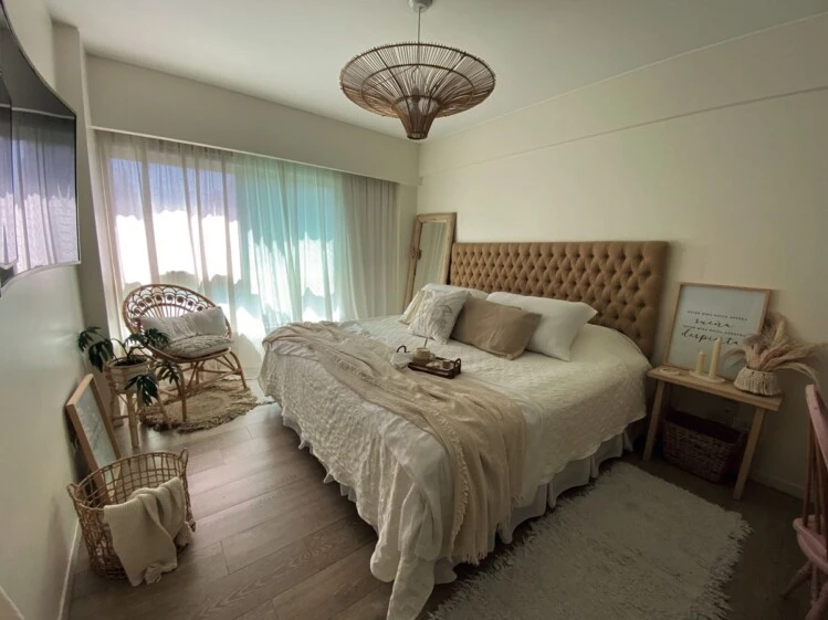 El amplio dormitorio principal se trabajó en un mix de tonos neutros y fibras naturales. Sobre la cama, se destaca la fusión total entre acolchado, pie de cama y los almohadones.