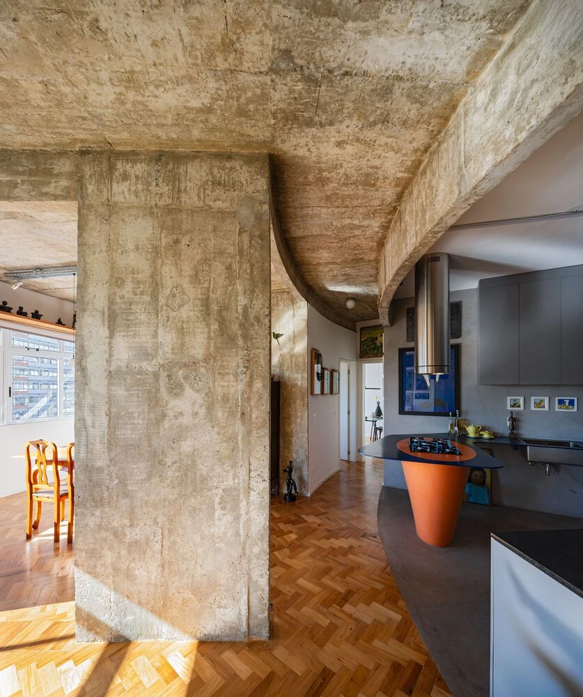 En el proceso descubrieron interesantes estructuras de hormigón escondidas detrás de una variedad de materiales y subterfugios, que decidieron integrar en el nuevo diseño del departamento.