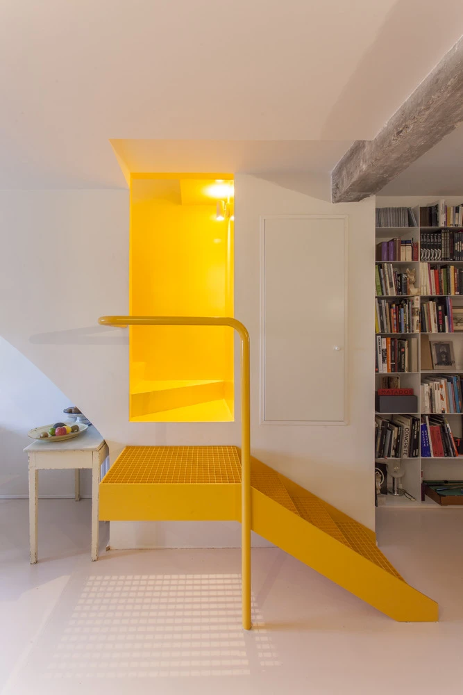 Por otro lado, a través de pinceladas de color amarillo, se consigue poner el acento en algunos rincones significativos de la casa.